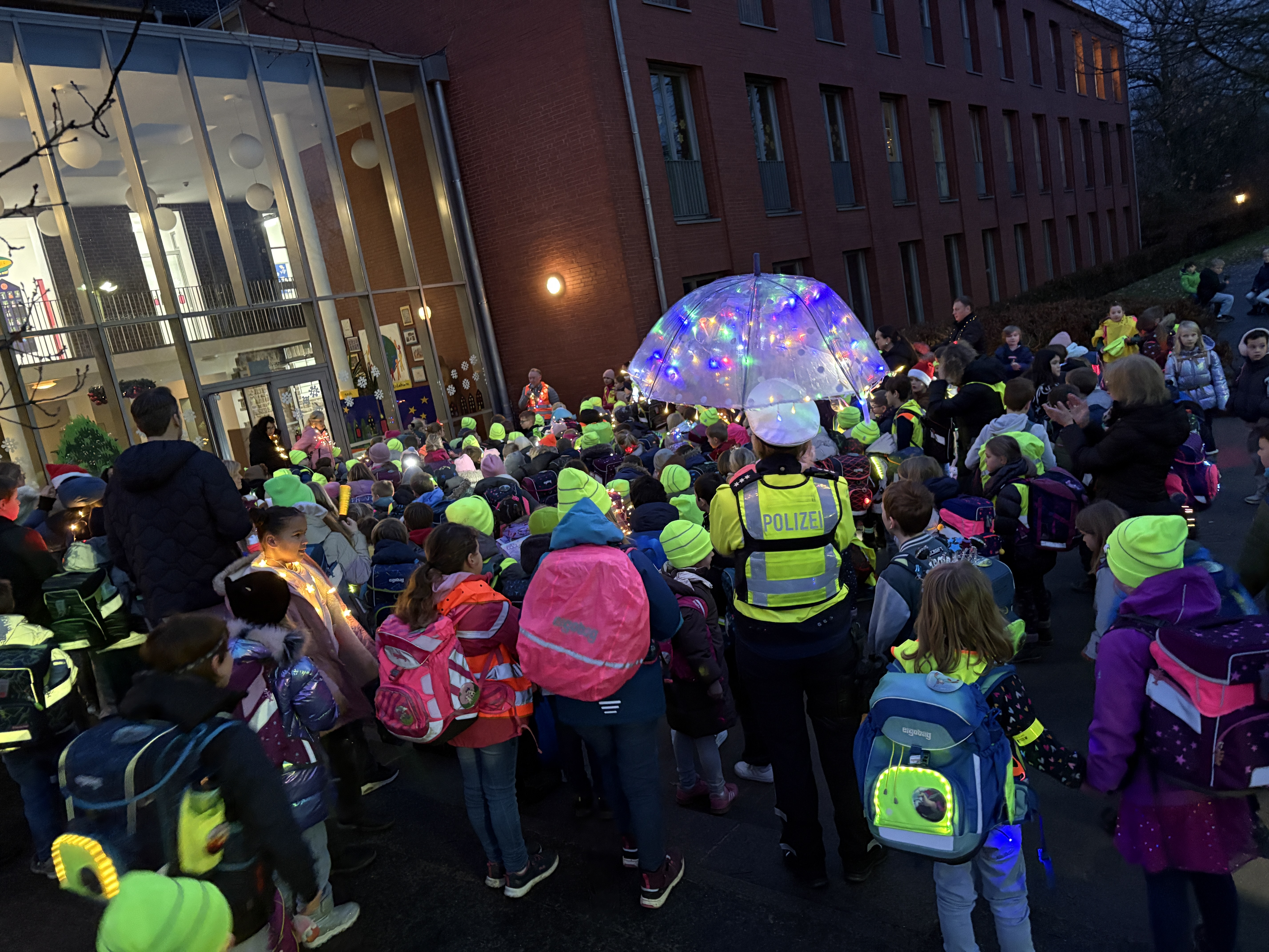 Die Schüler der Klasse 1 wurden mit leuchtend gelben Kappen ausgestattet, damit sie diese auf ihrem Schulweg tragen können und gut erkennbar sind.