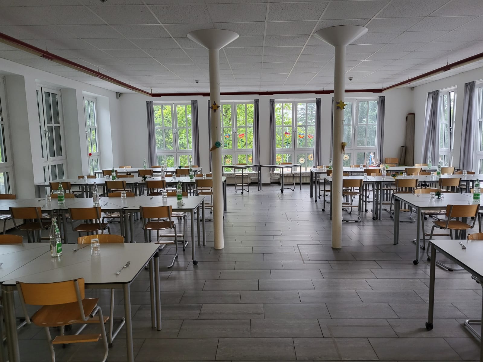 Die Kinder sitzen in der Mensa an Gruppentischen mit 6-8 Kindern und einer festen Bezugsperson.